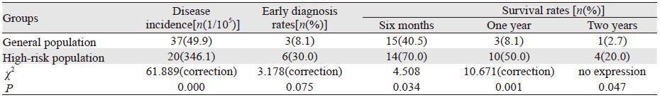 初筛和随访高危人群组早期癌6例,占30.0%(6/20),而一般人群组肝癌早诊率为8.1%(3/37)。两组肝癌早诊率差异无统计学意义(χ2=3.18,P=0.075)。一般人群组的肝癌患者半年、1年和2年生存率分别为40.5%、8.1%和2.7%,分别低于高危人群组的70%、50%和20%,各期生存率差异有统计学意义(χ2=4.508,P=0.034;χ2=10.671,P=0.001;Fisher确切概率法χ2未见表达,P=0.047),见表 2。