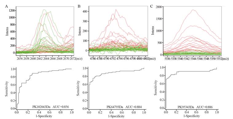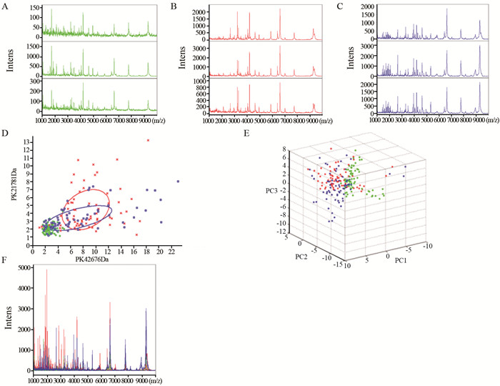 Methods Serum samples of normal control (CRTL, n=72), colorectal cancer (pre-operation CRC, n=72, and post-operation CRC, n=72) were collected from 2014-9-1 to 2016-9-1. Peptidome of all samples were extracted by magnetic-bead-based weak cation-exchange chromatography (MB-WCX) and detected by calibrated Autoflex Ⅲ MALDI-TOF-MS. Peptide mass fingerprinting were analyzed by ClinProtTools 2.0 software, and the differentially-expressioned peptides were further identified using LC-ESI-MS/MS.
