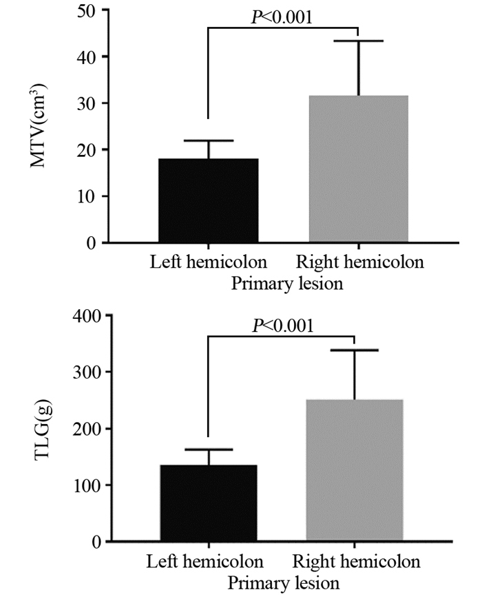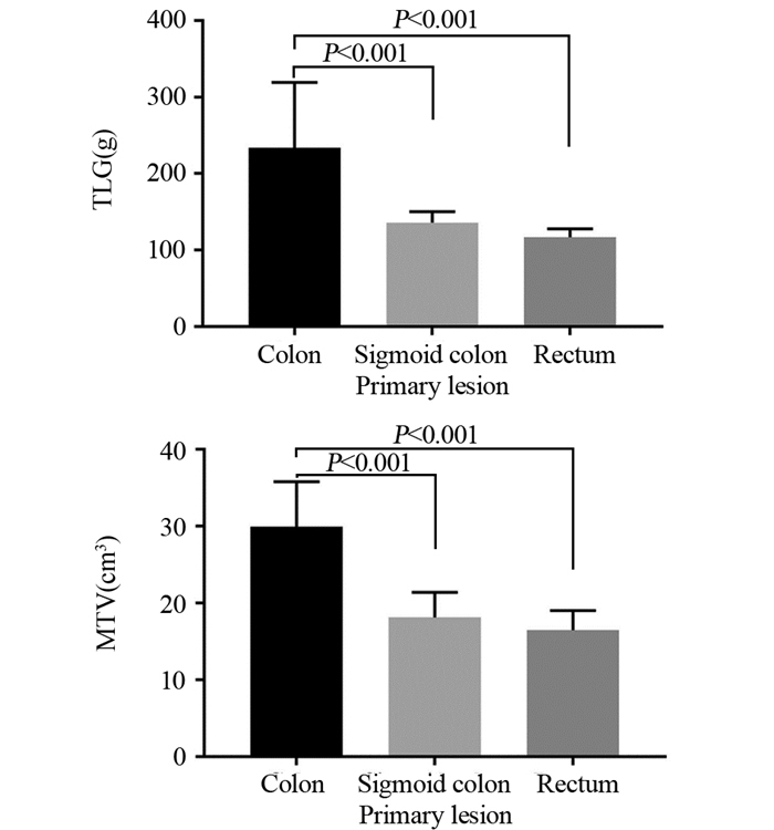 Results The MTV and TLG values in the primary foci of colon cancer were the highest, followed by sigmoid cancer and the lowest in rectal cancer, with statistically significant differences between the groups (P < 0.001). SUVmax values of poorly/poorly-moderately differentiated colorectal cancer were higher than those of moderately/well differentiated colorectal cancer (P=0.028). MTV values of primary mucinous adenocarcinoma were higher than those of primary adenocarcinoma (P=0.023). MTV and TLG values were higher in T4 lesions than those in T2-3 lesions (P=0.0001, P=0.007); SUVmax and SUVmean values of sigmoid carcinoma with distant metastasis were lower than those without distant metastasis(P=0.015, P=0.011).