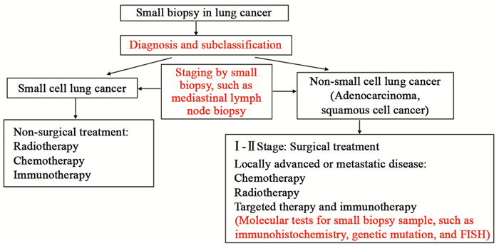 Early detection and accurate diagnosis for lung cancer is crucial to reduce disease-related mortality. Low-dose CT image is the main method of early lung cancer screening. This review introduces the importance of lung cancer screening and the feasibility of small biopsies of lung nodule in clinical practice, and focuses on how to obtain the sample from lung nodule efficiently with low cost and less side effect, and manage the specimen appropriately in order to achieve accurate diagnosis and following ancillary tests to guide clinical practice. We summarize the common pathological diagnosis and differential diagnosis in small biopsies, and the application of small lung biopsy in the pathological staging and molecular tests.