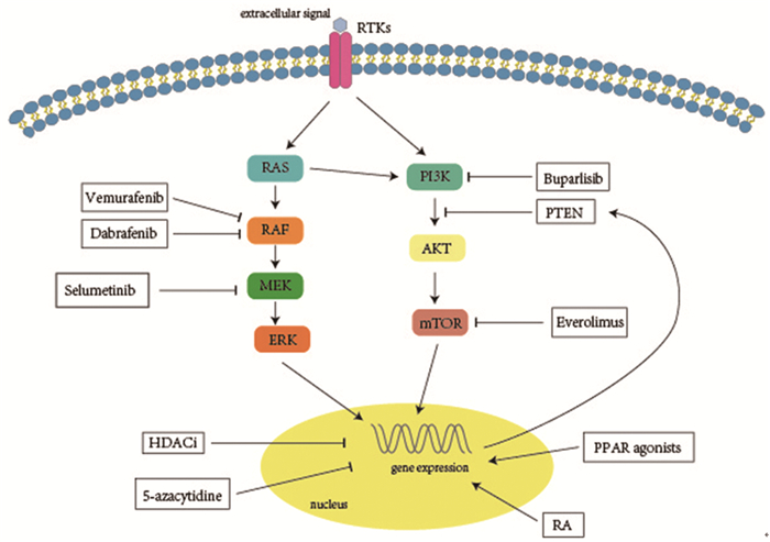 The majority patients of differentiated thyroid carcinoma (DTC) with indolent progression have general good prognosis after standard primary treatments including surgery, thyroid stimulating hormone (TSH) suppression and radioactive iodine (RAI) therapy. However, there are still some patients suffered from recurrence or distant metastasis after initial treatment. They may lose the ability of uptaking iodine during their natural course of disease or treatment and could not benefit from subsequent RAI treatment, which will result in radioiodine-refractory differentiated thyroid cancer (RAIR-DTC). Options are very limited for RAIR-DTC patients, which is associated with a poor prognosis. Recently, with the research advances on the molecular mechanism of RAIR-DTC, redifferentiation combined with RAI therapy have been increasingly used to treat RAIR-DTC, and some outcomes are quite encouraging. This paper reviews the progress of signaling pathway inhibitors, histone deacetylase inhibitors, DNA methyltransferase inhibitors, retinoids and peroxisome proliferator-activated receptor agonists in redifferentiating therapy of RAIR-DTC.