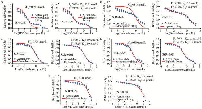 Results Compared with the monophasic kinetic analysis curve, the biphase analysis curve could better fit the effects of molecular targeted drugs on SK-Hep-1 cells, which predicted that the combination of HG6-64-1, Dasatinib, and MK-2206 could effectively inhibit the proliferation of SK-Hep-1 cells.