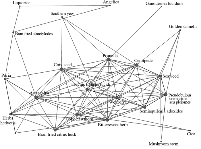 结果 3 234例肺癌患者使用的11 293付中药处方中,16味核心用药的核心处方是黄芪、茯苓、麸炒白术、红景天、薏苡仁、麸炒枳壳、焦山楂、女贞子、枸杞子、香菇柄、白英、蜈蚣、天葵子、海藻、夏枯草、山慈菇。