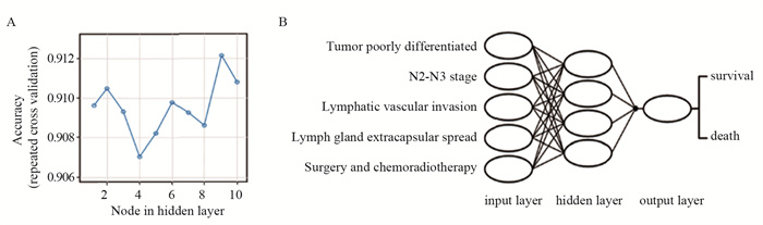 Results The proportions and 3 year survival rates of patients with poor differentiation, lymphatic vascular invasion, and involvement of lymph nodes outside the capsule in group C were significantly higher than those in groups A and B (P < 0.05). The 3 year survival rate of 132 patients was 68.94%(41/132). Poor differentiation, N2-N3 stage, lymphatic vascular invasion, and involvement of lymph nodes outside the capsule were risk factors for death (P < 0.05), whereas surgery combined with radiotherapy and chemotherapy were protective factors (P < 0.05). The BP neural network model exhibited good discrimination and high accuracy.