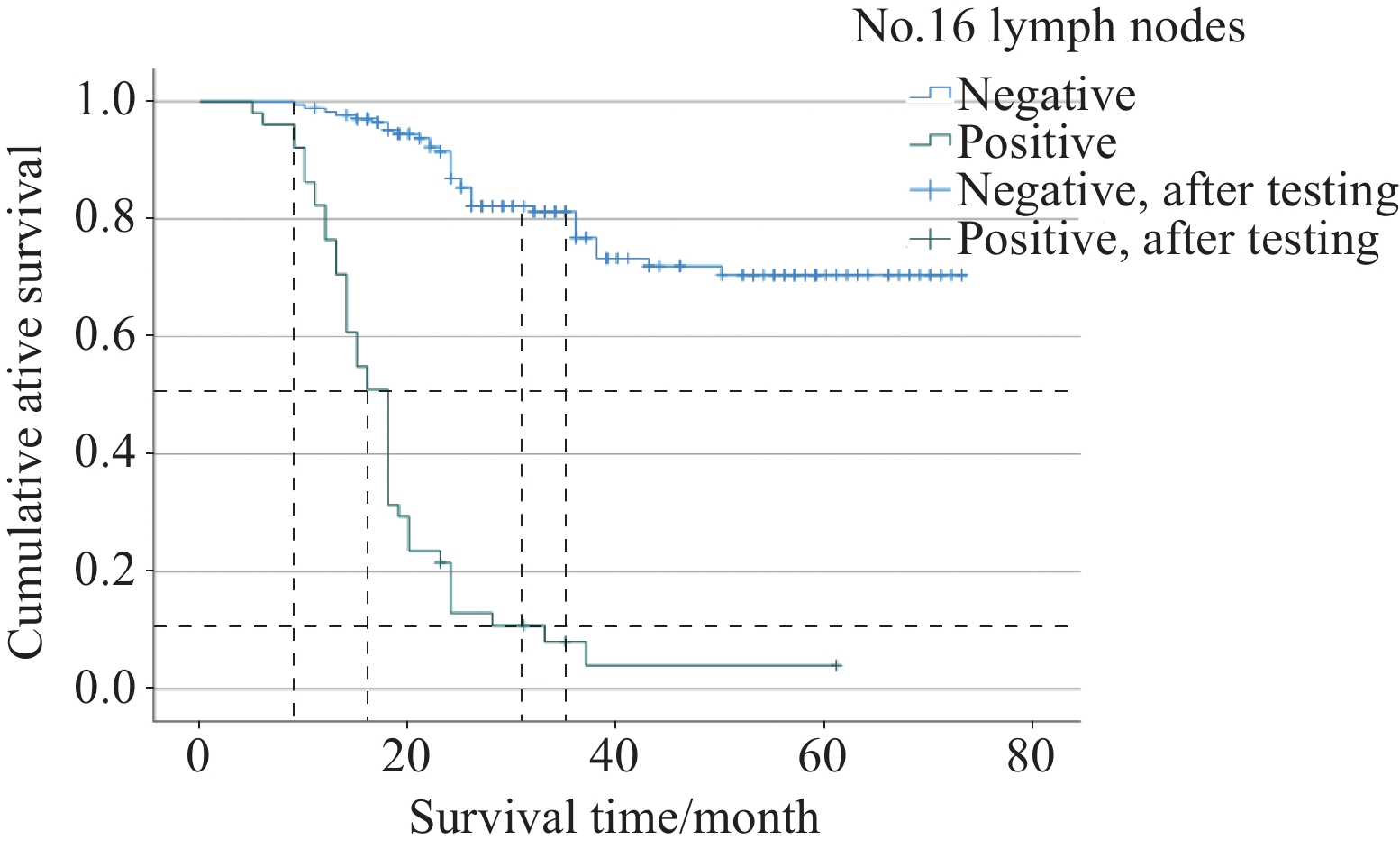 Methods This single-center retrospective case study collected the clinical and pathological data of 224 patients with esophagogastric junction malignant tumors undergoing radical resection. Single factor affecting lymph node metastasis in group 16 was analyzed by chi square test, and multiple factors were examined using logistic regression. Kaplan-Meier method was used for survival analysis, and Log rank test was used for survival rate comparison.