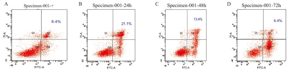 | A:control group; B: 24h; C: 48h; D:72h 图 1 0.82mg/ml GEM作用胰腺癌SW1990细胞株不同时间点后细胞凋亡分析 Figure 1 Apoptosis of pancreatic cancer cell line SW1990 treated with 0.82mg/ml GEM at different time points |