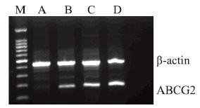 | M: marker;A:control group; B: 24h; C: 48h; D:72h 图 3 0.82mg/ml GEM作用不同时间点后胰腺癌SW1990细 胞株中ABCG2 mRNA的转录情况 Figure 3 ABCG2 mRNA transcription in pancreatic cancer cell line SW1990 treated with 0.82mg/ml GEM at different time points |