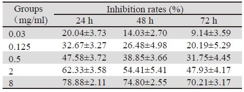 MTT结果显示,在同一浓度时,随着作用时 间的延长,GEM对细胞株的抑制逐渐减低,且两 两比较差异有统计学意义(P<0.05),在同一时间 点时,随着药物浓度的增加,GEM对细胞株的抑 制效应逐渐增强,且两两比较差异有统计学意义 (P<0.05)。24 h、48 h及72 h GEM对SW1990细胞 的IC50分别为(0.82±0.08) mg/ml、(1.58±0.16) mg/ml和(2.36±0.15)mg/ml,随着时间延长,IC50逐 渐增加(P<0.05)。可以得出,GEM对胰腺癌细胞 株SW1990有明显的时间和浓度依赖性,见表 1。