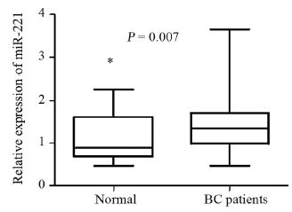 | 图 1 乳腺癌患者中血浆miR-221的表达 Figure 1 Plasma miR-221 expression levels in breast cancer (BC) patients |