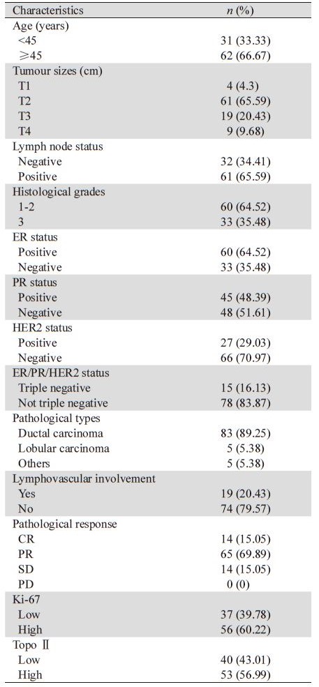 本研究中93例患者的临床特征见表 1。所有 患者均接受了以蒽环类和紫杉类为基础的NAC治 疗。诊断时患者的中位年龄为47岁(25~73岁)。 多数患者为浸润性导管癌。一半以上的患者为T2 期同时伴有腋窝淋巴结阳性。大约1/5的患者伴有 脉管浸润,绝大多数患者HR阳性。治疗后大约 15%的患者达到pCR,整体有效率(ORR=pPR+ pCR)为84.94%。