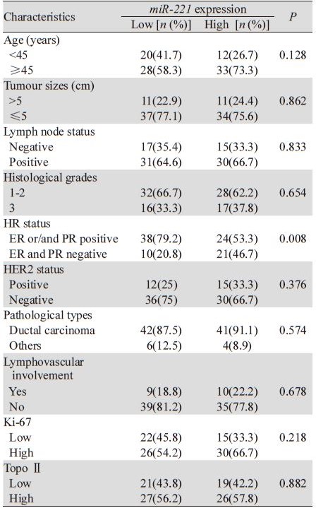 根据患者中位表达水平分为miR-221高表达组 和低表达组。血浆miR-221表达水平与患者临床病 理特征的关系,见表 2。结果显示血浆miR-221的 表达仅与患者HR状态显著相关(P=0.008),而 与其他临床病理特征如患者年龄、淋巴结状态、 HER2状态、Ki-67水平、TopoⅡ水平、病理类 型、组织学分级、肿瘤大小、脉管浸润等无关。 高miR-221表达组的患者倾向于HR表达阴性。