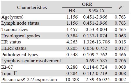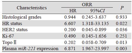对miR-221高表达组和低表达组进行比较时发 现两组中ORR差异有统计学意义(P=0.044),但 pCR率差异无统计学意义,见表 3。进一步采用单 因素方差分析的方法来分析临床病理因素、血浆 miR-221表达水平与ORR的相关性,发现与ORR相 关的因素包括病理分级、HR状态、HER2表达、 Ki-67的表达、TopoⅡ水平和血浆miR-221的表达高 低,见表 4。多因素分析结果显示HR状态、HER2 表达、TopoⅡ水平和血浆miR-221的表达高低均为 独立的化疗反应预测因素。HR阳性、血浆miR-221 高表达、HER2阴性、TopoⅡ低表达的患者更易对 NAC治疗耐药,而Ki-67表达水平则未能作为独立 的NAC耐药预测指标,见表 5。