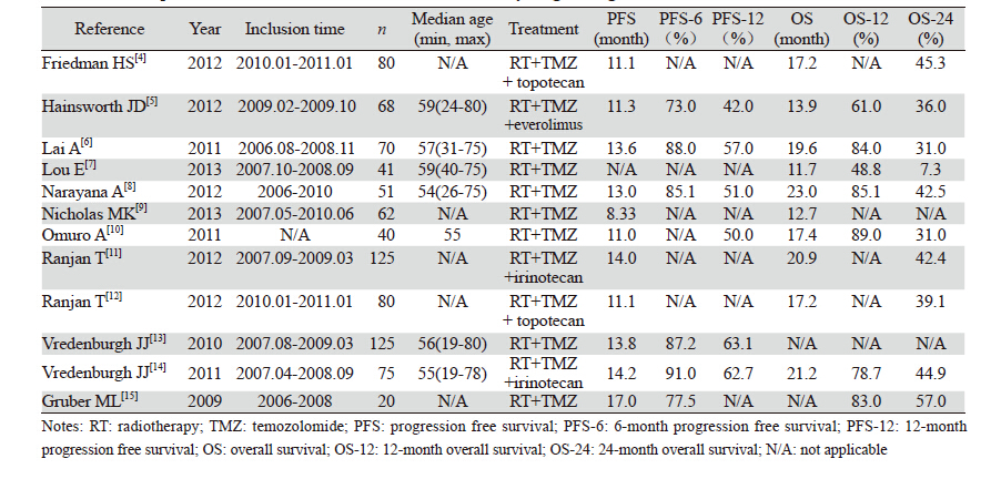 文献纳入标准:研究类型为临床试验(Ⅱ或Ⅲ 期)。研究对象为应用贝伐单抗多药联合治疗的新 诊断的胶质母细胞瘤患者。每项研究患者数需大 于10例,有完整的生存数据。文献排除标准:排 除动物实验、机制研究、重复发表、个案报道及 综述等文献。 1.2 文献检索策略
