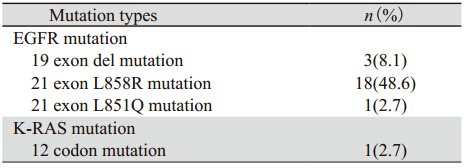 入组37例均接受胸腔镜手术治疗,无中转开胸,胸腔镜下探查26例先行楔形切除,冰冻快速病理明确恶性后再行肺叶切除,8例因不能明确病变结节定位而直接行肺叶切除术(均包括纵隔淋巴结清扫);另有术前证实1例因对侧纵隔淋巴结转移、2例因远处骨转移,手术仅以楔形切除明确病理类型。全组病例术后恢复顺利,术后病理显示,16例为AIS,13例为微浸润腺癌(micro infiltrating adenocarcinoma,MIA),8例为腺癌。2.3 EGFR及K-RAS基因突变检测结果