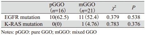 分析pGGO与mGGO的基因突变情况,两组EGFR基因发生突变者各有10例及11例,差异无统计学意义(P>0.05);而仅有的1例K-RAS基因突变发生在mGGO组,比较差异无统计学意义(P>0.05),见表 3。