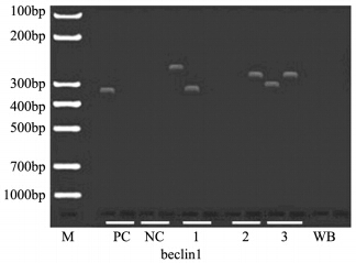 | M: marker; PC: positive control; NC: negative control; WB: water blank; 1-3: methylation-specific PCR and non methylation-specific PCR product; bp: base pair; MSP: methylation-specific PCR图 1 肝细胞癌组织中beclin 1基因的MSP产物 Figure 1 MSP products of beclin 1 in hepatocellular carcinoma(HCC) tissues |