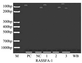 | 图 2 肝细胞癌组织中RASSFA基因的MSP产物 Figure 2 MSP products of RASSFA in HCC tissues |