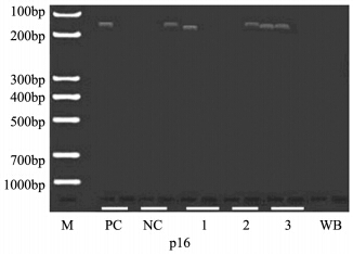 | 图 3 肝细胞癌组织中p16基因的MSP产物 Figure 3 MSP products of p16 in HCC tissues |