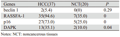 肿瘤是一系统性疾病,癌旁组织很可能已有 癌发生前期、早期的遗传学和表观遗传学的异 常;推测基因所发生的启动子甲基化谱式的变化 很可能代表肝癌早期和晚期的变化。属于早期阶 段的基因有RASSF1A;而属于晚期阶段的基因为 pl6[7]。RASSF1A是被广泛研究的抑癌基因,参与 了肿瘤发生发展的全过程。p16基因的编码产物 P16蛋白是作用于细胞分裂周期的关键酶之一, 它直接作用于细胞周期抑制细胞增殖,如表达缺 失则致细胞永生化形成肿瘤。beclin 1是位于染色 体17q21的一种抑癌基因,Li等研究20例散发侵袭 性乳腺导管癌,发现45%的乳腺癌检获杂合性缺 失及5' 末端到内含子2密集的CpG岛。甲基化分析 显示,beclin 1启动子和内含子2异常甲基化,且 肿瘤beclin 1表达下降。由此提出一个假设:乳腺 癌中BRCA1和beclin 1 具有协同效应。此论点在 肝癌中的作用有待进一步证实[8]。DAPK基因所编 码的死亡相关蛋白激酶(death-associated protein kinase,DAPK)参与干扰素、Fas、肿瘤坏死因 子-α等多条凋亡途径。本实验发现,HCC中beclin 1、DAPK的甲基化率较低,但DAPK在癌旁组织 中亦有一定程度的甲基化且差异具有统计学意义 (P=0.04),提示HCC中,DAPK基因甲基化的 发生是一种早期且普遍存在的现象;对其甲基化 的检测,有可能成为早期发现肿瘤的一种有效手 段。在本研究中p16和RASSF1A基因高甲基化体现 出较高的诊断价值。