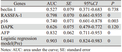 将AFP>3.6 mg/L为阳性界值,进行计数资料 转换,逐步Logistic回归法和模拟变量的ROC曲 线,运用软件逐步回归,beclin 1、p16和DAPK 被剔除,beclin 1、RASSFA-1、p16、DAPK和 AFP(转换后),Logistic回归曲线联合预测概率 (Pre)曲线下面积(area under the curve,AUC) 分别为0.527、0.798、0.740、0.626、0.832和 0.903,见图 5。其中beclin 1与DAPK的AUC显示差 异无统计学意义,见表 3。