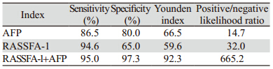 根据 ROC曲线和逐步Logistic回归,计算出各指标的敏感度、特异性、Youden指数(敏感度+特 异性-1)和阳性似然比/阴性似然比。联合分析: 以AFP为基本指标,在此基础上与RASSFA-1指标 联合分析,按任一指标超过“界值”即定为肝癌, AFP、 RASSFA-1的Youden指数、阳性似然比/阴 性似然比最高,并兼顾了较高的敏感度和特异性, 见表 4。