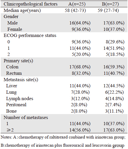 1 资料与方法 1.1 一般资料选取2011年7月—2013年8月在蚌埠医学院第 一附属医院住院治疗的晚期及复发转移性结直 肠癌52例。A组25例:男性16例,女性9例;年 龄42~73岁,中位年龄61岁;结肠癌17例,直肠 癌8例。B组27例:男性17例,女性10例;年龄 27~74岁,中位年龄62岁;结肠癌16例,直肠癌11 例。所有患者均有明确的病理组织学或细胞学诊 断;两组患者均使用FOLFOX(包括FOLFOX4, mFOLFOX6)一线方案化疗后病情进展;既往均 未使用过雷替曲塞治疗;ECOG评分:0~2分;年 龄18~75岁;至少有一个CT或MRI可测量的客观 靶病灶;预计生存期均超过3月;血常规及肝肾 功能基本正常,无化疗禁忌证;无长期慢性腹泻 病史及肠梗阻史;并能随访。两组患者年龄、转 移部位及数目等临床特征比较差异无统计学意义 (P>0.05),见表 1。