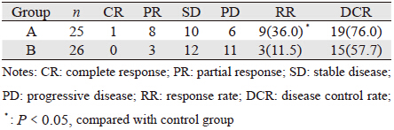 2 结果 2.1 近期疗效A组共完成164周期化疗,B组共完成171周期 化疗,B组中有1例患者出现Ⅳ度腹泻退出治疗, 不纳入疗效评价,但纳入不良反应评估。A组CR 1例,PR 8例,SD 10例,PD 6例;B组无CR病 例,PR 3例,SD 12例,PD 11例。两组RR分别为 36.0%和11.5%,差异有统计学意义(χ2=4.238, P=0.040),DCR分别为76.0%和57.7%,差异无统 计学意义(χ2=1.922,P=0.166),见表 2。
