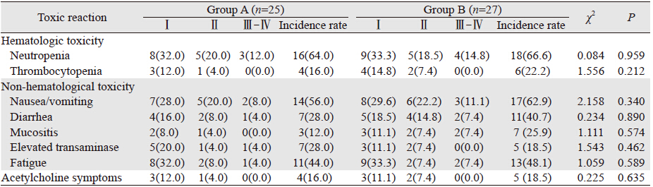 两组治疗的主要不良反应是中性粒细胞减 少、乏力和胃肠道反应,大多为Ⅰ~Ⅱ度。特有的 不良反应主要是延迟性腹泻,多为Ⅰ~Ⅱ度,Ⅲ度 以上腹泻发生率低,经规范使用易蒙停解救治疗 后,能在短时间内控制症状,B组有1例患者因Ⅳ 度腹泻退出治疗,A组黏膜炎的发生率较B组低, 但两组不良反应的发生率比较差异无统计学意义 (P﹥0.05),无治疗引起相关性死亡,见表 3。