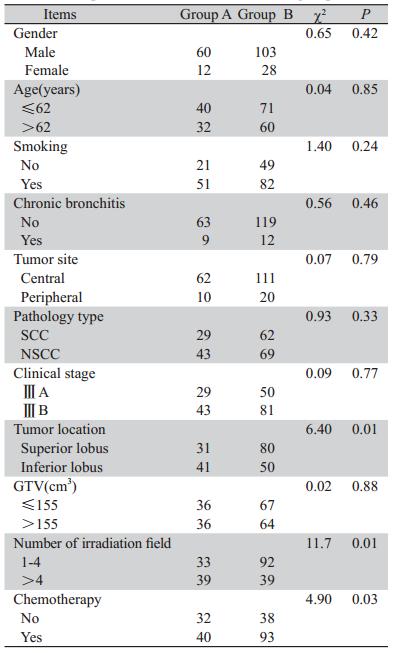 A组与B组中,性别、年龄、吸烟状况、是否 合并慢支、原发肿瘤分型(中央型/外周型)、临 床分期、病理类型、GTV、CTV、PTV等因素两 组间比较差异均无统计学意义(P>0.05);而化疗、 放疗剂量和肿瘤位置(肺上叶/肺下叶)两组比较 差异有统计学意义,B组联合化疗者、肿瘤位于肺 上叶者明显多于A组,而A组照射剂量高于B组,A 组照射野数明显多于B组(P<0.05),见表1、2 。