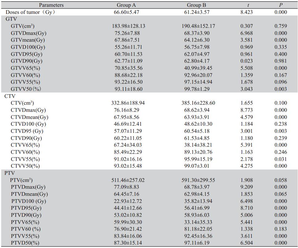 表2 两组非小细胞肺癌患者靶区剂量分布比较 Table 2 Comparison of dosimetric parameters between group A and B |
