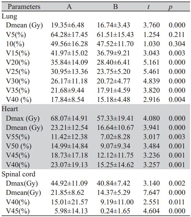 s A组肺Dmean、肺V15~V40均明显高于B组 (P<0.01);而V5、V10两组比较差异无统计学 意义(P>0.05)。A组脊髓Dmax、Dmean、V45 均显著高于B组(P<0.01)。而B组脊髓V40显著 高于A组(P=0.035)。A组心脏Dmax、Dmean、 V55~V40均显著高于B组(P<0.01),见表3。