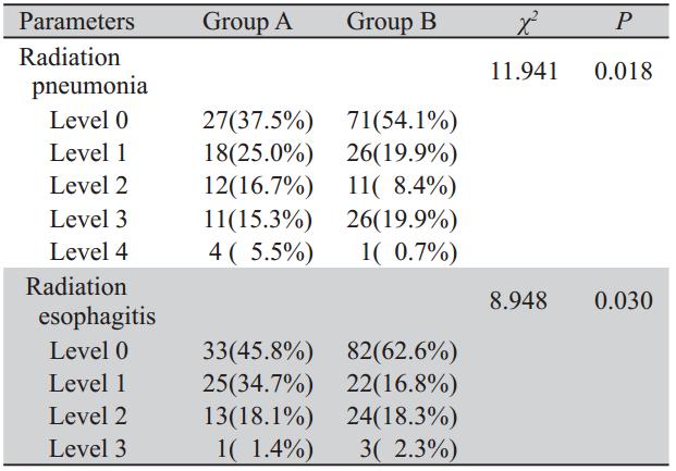 全组放疗后,至随访截止时间,已死亡172 例,目前存活31例。放疗后CR 32例、PR 118例、 SD 25例、PD 8例,有20例放疗结束时疗效未评 价。全组放疗后1、3、5年总生存率和中位生存 期分别为54.6%、18.8%、14.5%和14.4月。A组和B 组1、3、5年生存率和中位生存期分别为45. 8%、15.3%、10.5%、10.2月和59.3%、20.8、16.9%、 18.0月(χ2=4.409,P=0.036)。A组急性期放射性肺炎 和食管炎发生率明显高于B组(P<0.05),见表4。