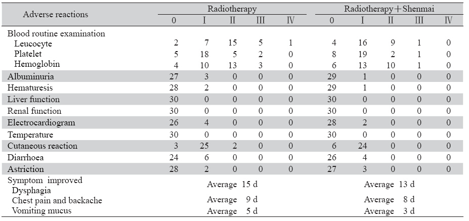 本研究是在食管癌患者放疗期间,应用参脉 注射液静脉点滴,来观察参麦注射液是否具有放 疗增敏作用。从安全性方面各项指标可以看到, 不论从血细胞、肝肾功等客观检查指标、还是症 状改善等主观指标,放疗联合参脉注射液的治疗 组均优于单纯放疗组。其中,单纯放疗组中白细 胞0~Ⅰ度不良反应病例占30%,而联合治疗组占 66.7%,Ⅱ~Ⅳ度不良反应分别为70%和33.3%,经 统计学分析,两组间差异显著,说明参麦注射液在血细胞的保护方面有优势,这一结果与张松等[11] 的研究结果一致。而血红蛋白及血小板等观察指 标,治疗组较对照组有改善趋势,未看到统计学 差异。同样,在其他各观察指标上,也有类似的 现象。