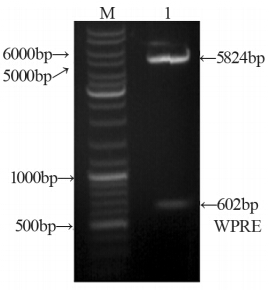 以pCMVgWPRE质粒为模板扩增WPRE基因, 扩增产物进行测序,所得序列结果(图略)与 GenBank报道的完全一致。 2.2 重组载体的鉴定