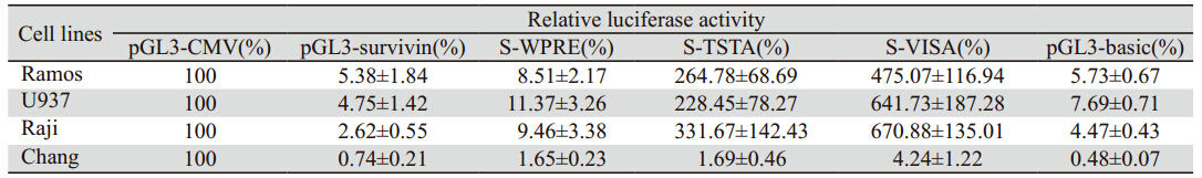 以pGL3-CMV为阳性对照(100%),pGL3-Basic 为阴性对照,荧光素酶检测结果,见表 1。转染 S-WPRE后Ramos、U937、Raji及chang liver细胞的 荧光素酶表达水平均明显低于转染pGL3-CMV细 胞(P<0.01);转染S-TSTA、S-VISA后Ramos、 U937、Raji细胞的荧光素酶表达水平均高于转染 pGL3-CMV细胞(P<0.01),而Chang Liver细胞中 的表达水平低于转染pGL3-CMV细胞(P<0.01)。 转染S - VSIA后Ramos、U937、Raji细胞 中的荧光素酶表达水平高于转染S - TSTA细胞 (P<0.05),而在Chang Liver细胞中表达水平差 异无统计学意义(P>0.05)。