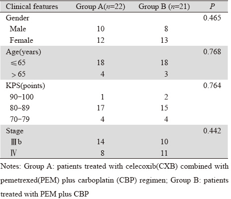 选取2010年11月─2011年6月在郑州大学第一 附属医院肿瘤科收治的晚期肺腺癌患者43例。入选 标准:年龄在18~75岁,KPS评分≥70分,性别不 限;均经病理学确诊为肺腺癌的ⅢB/Ⅳ期的初治患 者,预计生存期>3月;根据实体瘤疗效评价标准 (RECIST)至少有一个明确可测量的肿瘤病灶; 无明显肝、肾、血液系统等功能障碍(≤Ⅰ度),心 肺功能无明显异常;既往无长期服用NSIDS类及免 疫抑制类药物史;患者自愿签署知情同意书,依从 性良好。排除标准:妊娠期或哺乳期妇女;存在其 他肿瘤病史;存在其他疾病需近期或以后长期服 用NSIDS类及免疫抑制类药物;存在其他合并症而 不能或不愿接受叶酸、维生素B12、地塞米松治疗 的患者;有溃疡或出血史;有冠心病、糖尿病史。 根据上述标准共有43例患者入组,采用数字表法 随机分为A、B两组。A组22例,接受塞来昔布联 合培美曲塞和卡铂方案化疗;B组21例,接受培美 曲塞和卡铂方案化疗。两组患者一般资料的差异 无统计学意义,具有可比性,见表 1。