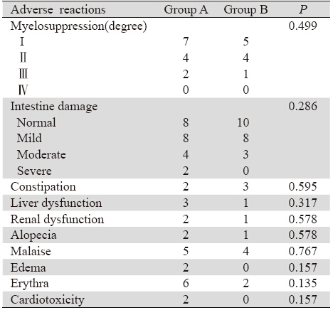 A组中骨髓抑制13例(59.1%)、胃肠道损 害14例(63.6%,其中2例发生重度消化道损害 而停药)、便秘2例(9.1%)、肝功能异常3例 (13.6%,表现为转氨酶轻度升高)、肾功能异 常2例(9.1%,表现为尿素氮轻度升高)、脱 发2例(9.1%)、乏力5例(22.7%)、水肿2例 (9.1%,分别为眼睑部及双下肢的轻度水肿)、 皮疹6例(27.3%)、心脏毒性2例(9.1%,1例表 现为心脏缺血,1例表现为频发室性早博,停药 后均消失)。B组中骨髓抑制10例(47.6%)、 胃肠道损害11例(52.4%,均为轻中度)、便秘3 例(14.3%)、肝功能异常1例(4.8%,表现为转 氨酶轻度升高)、肾功能异常1例(4.8%,表现 为尿素氮轻度升高)、脱发1例(4.8%)、乏力 4例(19.0%),皮疹2例(9.5%),未见水肿及 心脏毒性。两组比较差异均无统计学意义(P>0.05),见表 2。