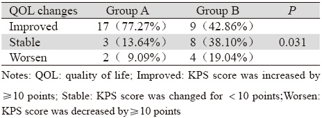 使用Karnofsky 评分方案,治疗后评分增加≥10分为改善,减少 ≥10分为降低,两者之间为稳定。 1.5 统计学方法