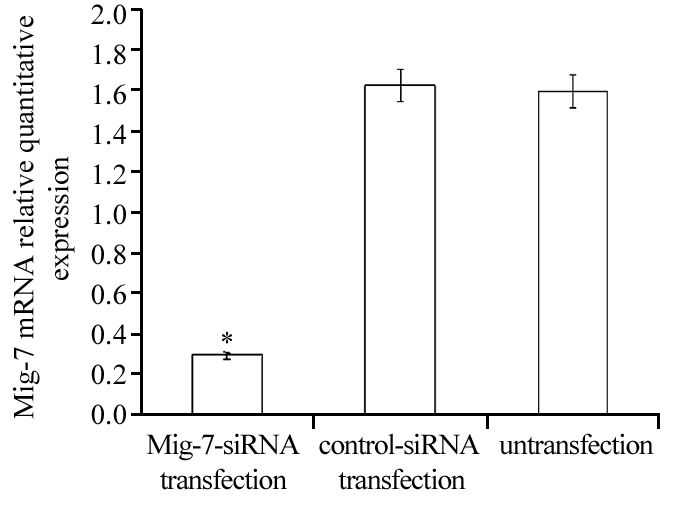 | *: P<0.05,compared with control-siRNA transfection and untransfection groups 图 1 转染后MKN45细胞Mig-7 mRNA的表达 Figure 1 Expression of Mig-7 mRNA in MKN45 cells after transfection |