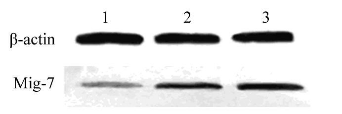 | 1: Mig-7-siRNA transfection group; 2. control-siRNA transfection group; 3. untransfection group 图 2 转染后MKN45细胞Mig-7蛋白的表达 Figure 2 Expression of Mig-7 protein in MKN45 cells after transfection |