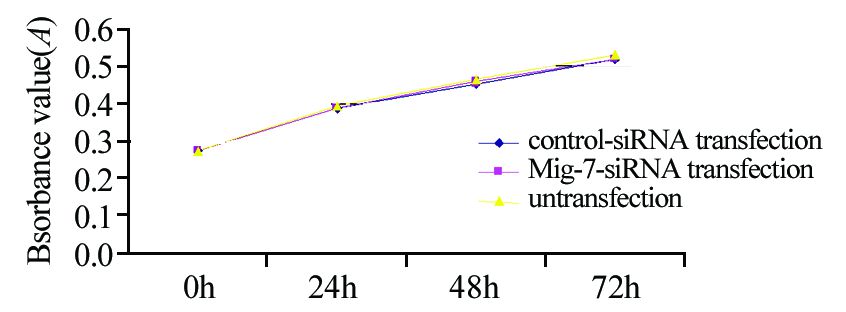 各时间观察点,转染组和空白转染组、转染组和未转染组、空白转染组和未转染组A570 nm的吸光度值比较,差异均无统计学意义[P=0.328,0.398,0.881(0 h),P=0.969,0.092,0.097(24 h),P=0.248,0.051,0.284(48 h),P=0.539,0.051,0.126(72 h),P>0.05],转染后72 h内细胞增殖差异无统计学意义(P>0.05),见图 3。