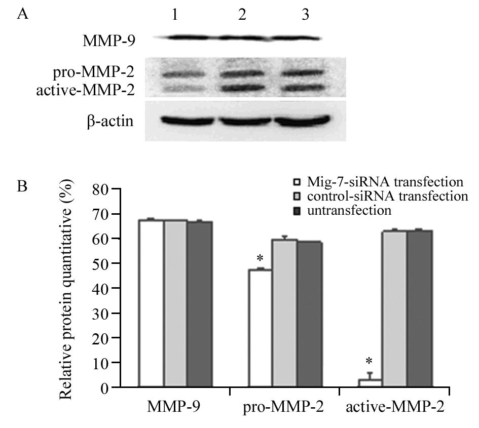 1.2.4 Western blot检测实验分组同1.2.3。转染后72 h提取蛋白,测定浓度。各组相等的总蛋白量进行SDS-PAGE电泳分离后,电转至PVDF膜上,50 g/L脱脂奶粉封闭60~90 min。一抗Mig-7(1:500)、MMP-2、MMP-9(1:1 000)及β-actin(1:2 000)4℃孵育过夜,TBST洗膜,分别室温孵育辣根过氧化物酶标记山羊抗鼠IgG(β-actin为辣根过氧化物酶标记山羊抗兔IgG)(1:2 000)2 h,TBST洗膜,化学发光(ECL)试剂盒显影。