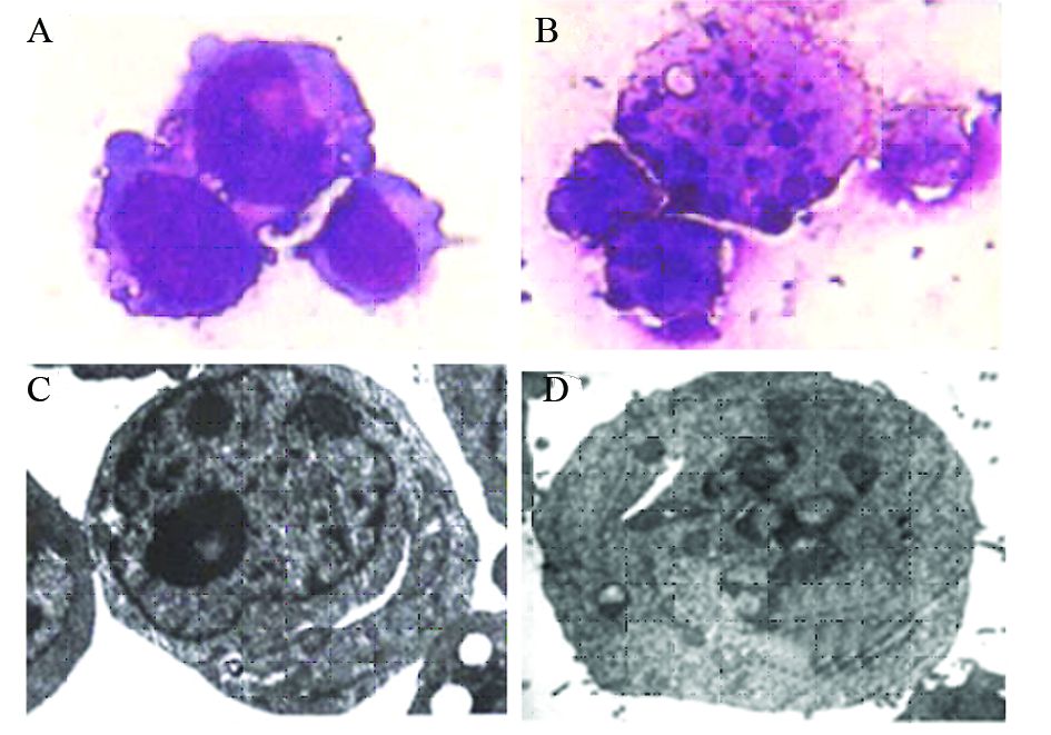 | A,C: K562EGFP cells; B,D: K562SHP-1 cells; A,B: reiter Giemsa staining (×1 000);C,D: electron microscope (×10 000) 图 6 过表达SHP-1后K562细胞形态学变化 Figure 6 Morphologic changes of K562 cells transfected with SHP-1 |