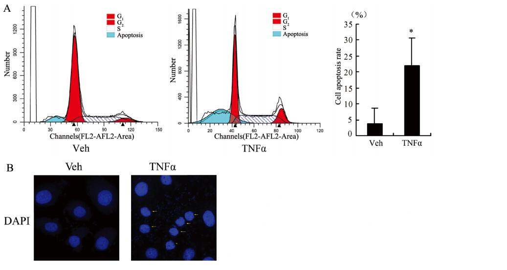 乳腺癌SK-BR-3细胞经TNFα(0、10 ng/ml)刺激24 h后,进行流式细胞术和DAPI染色分析乳腺癌SK-BR-3细胞凋亡和周期进程。结果显示,TNFα刺激后,应用流式细胞术检测到的乳腺癌SKBR-3细胞凋亡细胞比例显著增多(Veh:4.27%;TNFα:30.19%),见图 2A。DAPI染色后,在荧光显微镜下观察结果显示,TNFα刺激后,可见乳腺癌SK-BR-3细胞呈现核固缩,见图 2B。