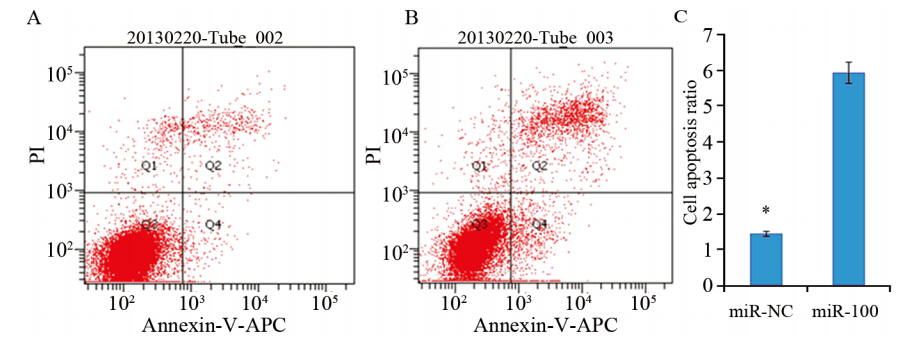 | A: miR-NC group; B: miR-100 group; C: compartion of cell apoptosis ratio in Q4 between two groups,*: P<0.05 图 2 流式细胞仪检测Ec-109细胞的凋亡 (Annexin-V-APC/PI) Figure 2 Apoptosis of Ec-109 cells analyzed by FACS (Annexin-V-APC/PI ) |