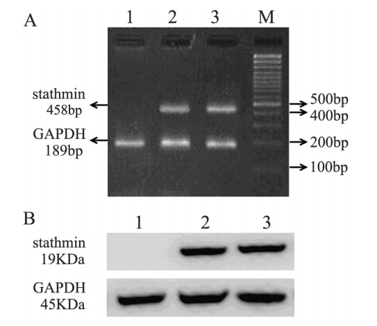 TRIzol法提取总RNA,按照试剂盒说明书反转录,GAPDH基因为内参。引物序列如下,stathmin:上游引物:5’-atggcttcttctgatatccag-3’,下游引物:5’-ttagtcagcttcagtctcgtc-3’;GAPDH:上游引物:5’-GGTATCGTGGAA GG ACTCATGAC-3’,下游引物:5'-ATGCCA GTGAGCTTC CCGTTCAGC-3。使用LightCycler480荧光定量PCR仪进行PCR反应。设定程序为两步法:预变性95℃,3 min;之后每一步94℃变性45 s,56℃复性45 s,72℃延伸45 s,共28个循环。最后72℃延伸7 min,至 4℃完成反应。采用LightCycler480 Software 1.5软件进行图像分析。实验重复3次。1.4 蛋白质印迹