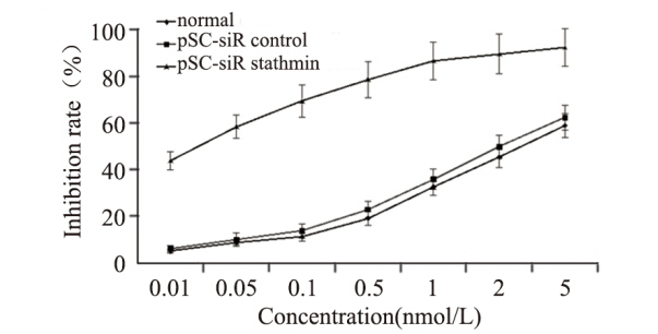 紫杉醇对pSC-siR stathmin转染、pSC-siR control转染和未转染KYSE150细胞的半数抑制浓度分别为:0.018、4.885和3.454 nmol/L,见图 2。相比未转染KYSE150细胞,pSC-siR stathmin转染KYSE150细胞对紫杉醇敏感度增强191.4倍。