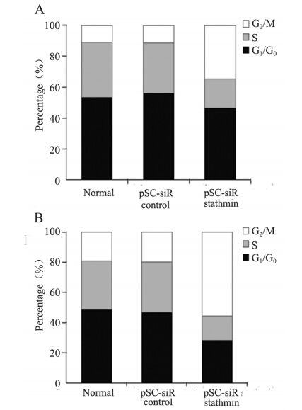 pSC-siR stathmin转染、pSC-siR control转染和未转染KYSE150 G2/M期细胞分别为(34.6±2.9)%、(11.2±2.0)%和(10.7±1.5)%,见图 3A。经紫杉醇干预后,pSC-siR control转染和未转染KYSE150 G2/M期细胞轻微增加,且两细胞系间差异无统计学意义;pSC-siR stathmin转染KYSE150细胞出现显著的G2/M期阻滞[(55.4±6.2)%,P=0.000],见图 3B。