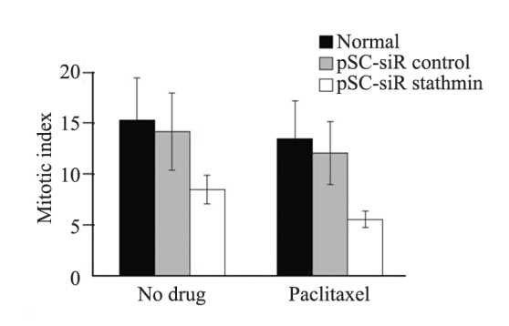 pSC-siR stathmin转染、pSC-siR control转染和未转染KYSE150细胞有丝分裂指数分别为(8.5±1.4)%、(14.2±3.8)%和(16.3±4.2)%,见图 4。经紫杉醇处理后,pSC-siR control转染和未转染KYSE150细胞有丝分裂指数轻微降低;pSC-siR stathmin转染KYSE150细胞有丝分裂指数显著降低[(5.6±0.8)%,P=0.000]。