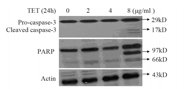 | 图 3 不同浓度TET对PC3细胞Caspase-3、PARP蛋白表达的影响 Figure 3 Effect of tetrandrine at different concentration on Caspase-3 and PARP protein expression |